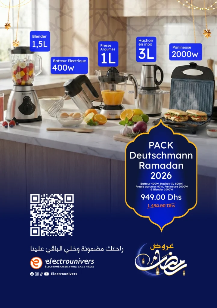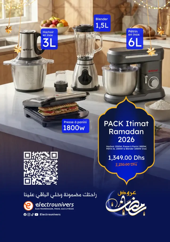 PACK Itimat Ramadan 2026 – Hachoir 1500W, Presse à Panini 1800W, Pétrin 6L 1300W et Blender 1000W Inox