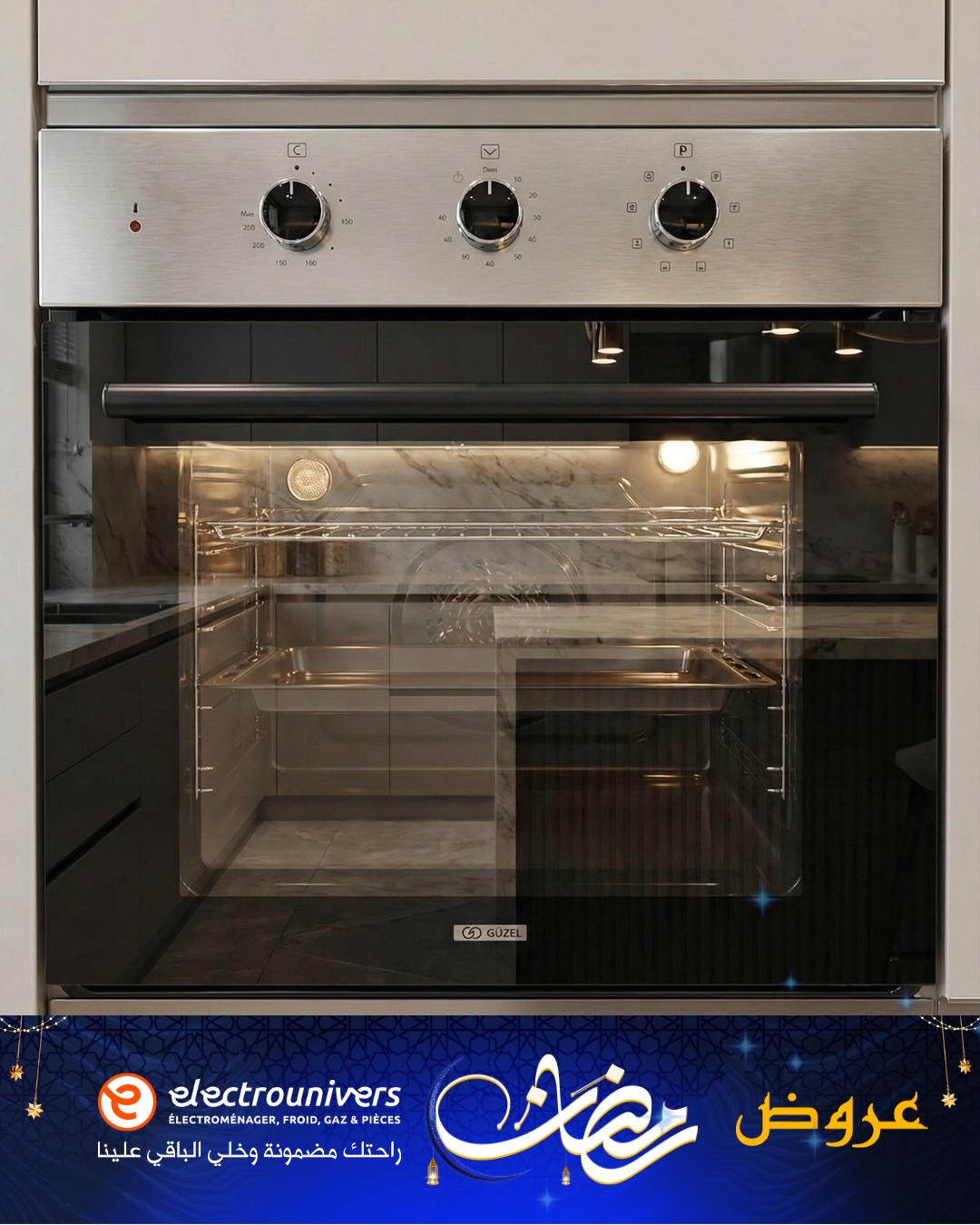 1. L’Assurance de la Compatibilité En achetant un pack, vous éliminez le risque d’incompatibilité esthétique. Les nuances d’inox peuvent varier d’une marque à l’autre. Ici, le four, la plaque et la hotte partagent le même ADN visuel « Guzel », garantissant un rendu haut de gamme et cohérent.