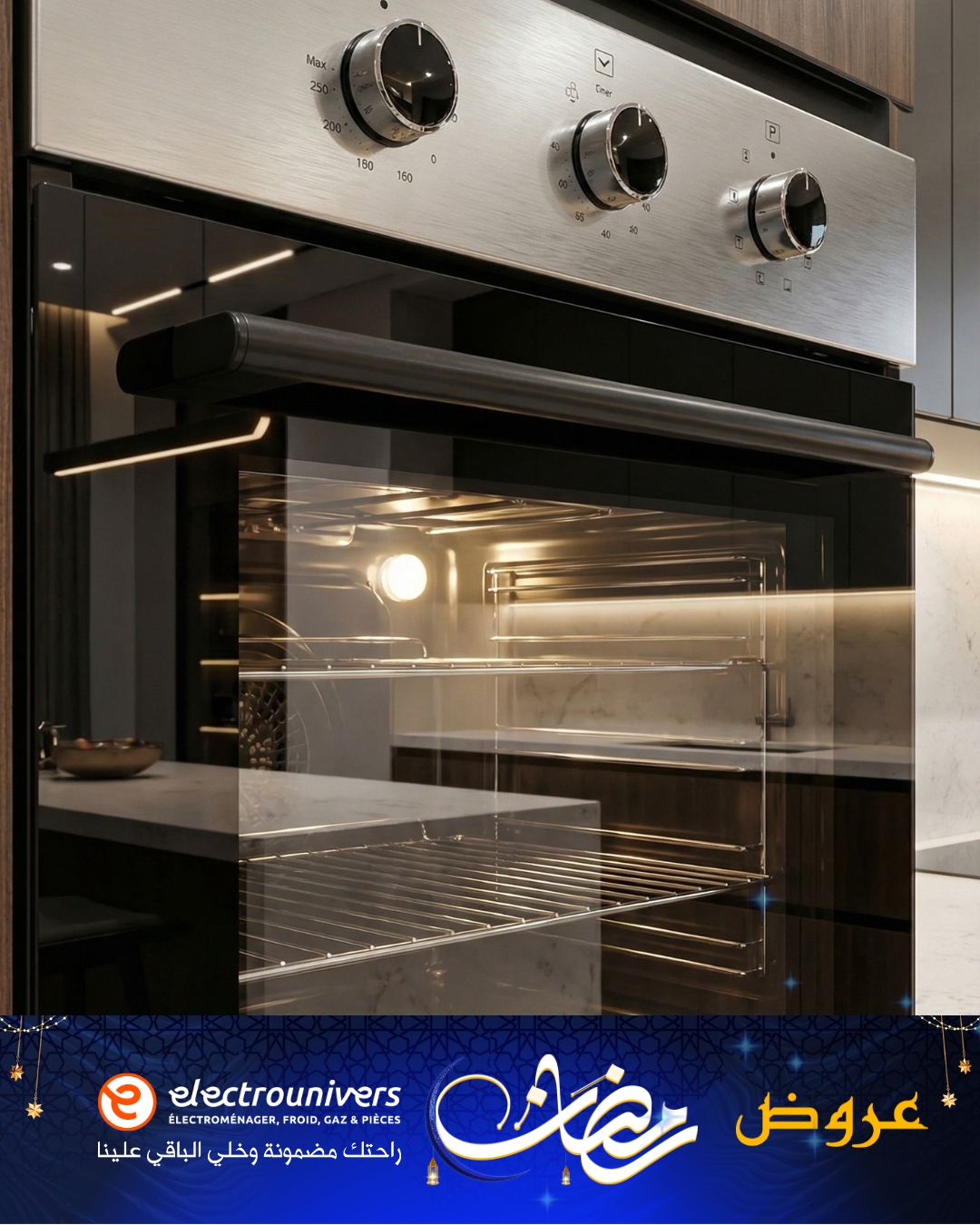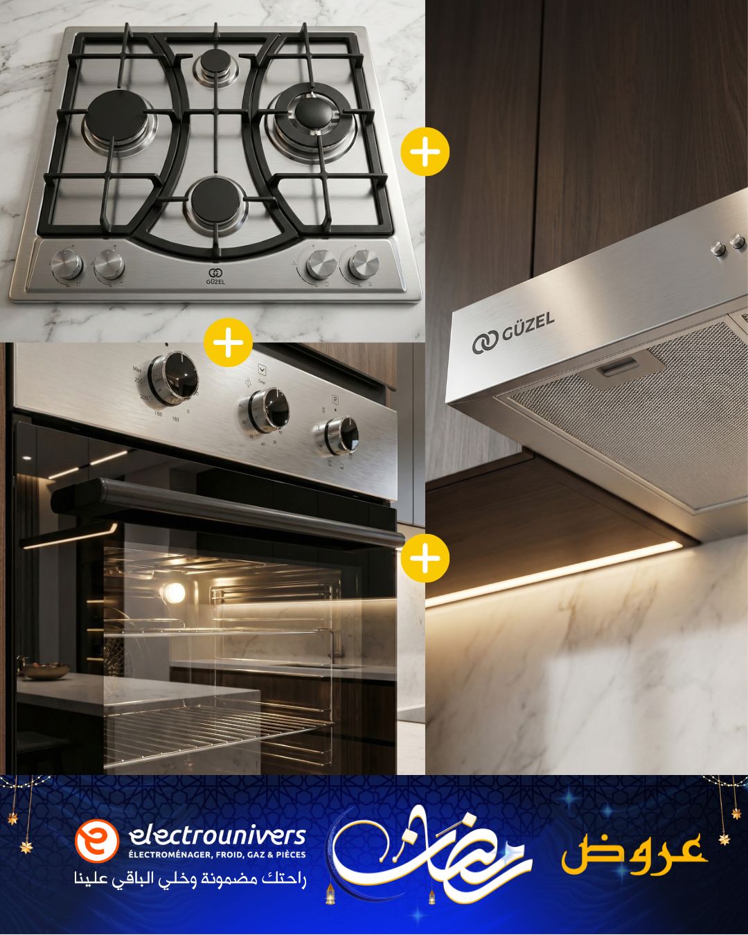Guzel Pack Cuisson x3 – L’Ensemble Encastrable Inox Complet (Four 60L + Plaque 4 Feux + Hotte 60cm)