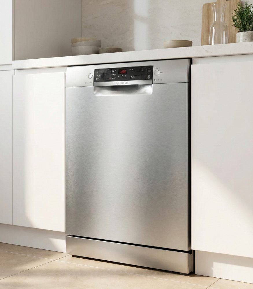 Lave-vaisselle Bosch Série 4 SMS45DI10Q Inox anti-traces, Le Bosch SMS45DI10Q (Série 4) est un lave-vaisselle pose libre 60 cm en inox anti-empreintes, idéal pour un usage quotidien. Il offre 12 couverts, un fonctionnement SilencePlus 46 dB, 5 programmes (dont Auto, Eco, Intensif et 1h) et des options pratiques comme Demi-charge et HygienePlus. Grâce à AquaStop, RackMatic et DosageAssist, vous profitez d’un lavage efficace, économique et simple à utiliser.