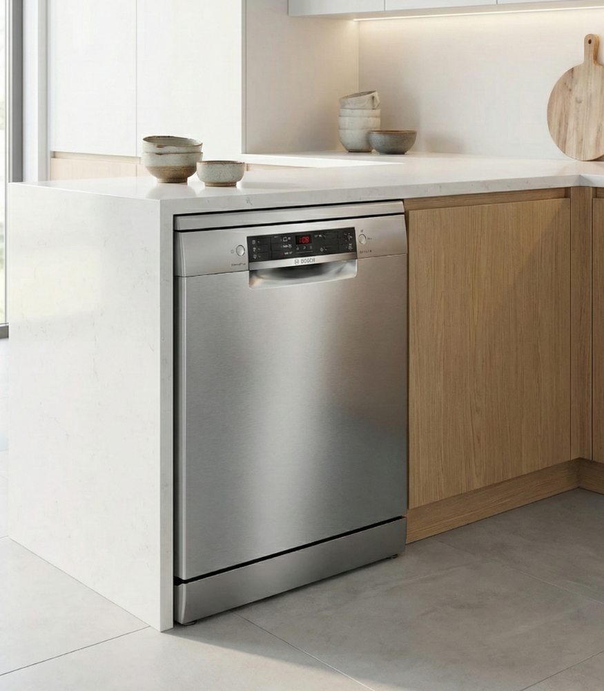 Le Bosch SMS45DI10Q se distingue par sa finition inox brossé anti-traces, élégante et facile à entretenir. En format pose libre 60 cm, il s’installe facilement dans la majorité des cuisines. Son top est amovible, ce qui permet une intégration sous plan de travail si nécessaire.