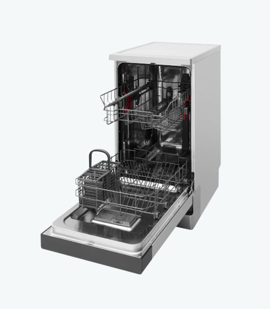 Capacité & format : 10 couverts dans un châssis de seulement 45 cm de large. Ce format slim facilite l’installation dans les petits espaces sans sacrifier le volume de vaisselle traité par cycle. Hauteur standard 85 cm (top amovible pour encastrement sous plan si nécessaire) et profondeur 59 cm.