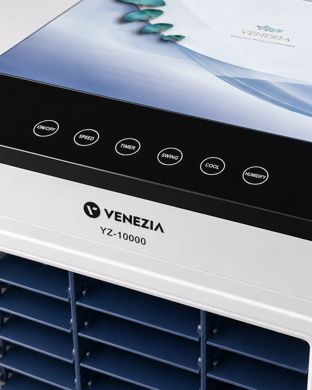 Le Rafraîchisseur d’air Venezia 60L télécommande 210W YZ-10000R est un rafraîchisseur d’air mobile destiné à améliorer le confort en période chaude grâce à un réservoir d’eau intégré. Les informations techniques reprises ici proviennent de la plaque signalétique fournie pour le modèle YZ-10000R.