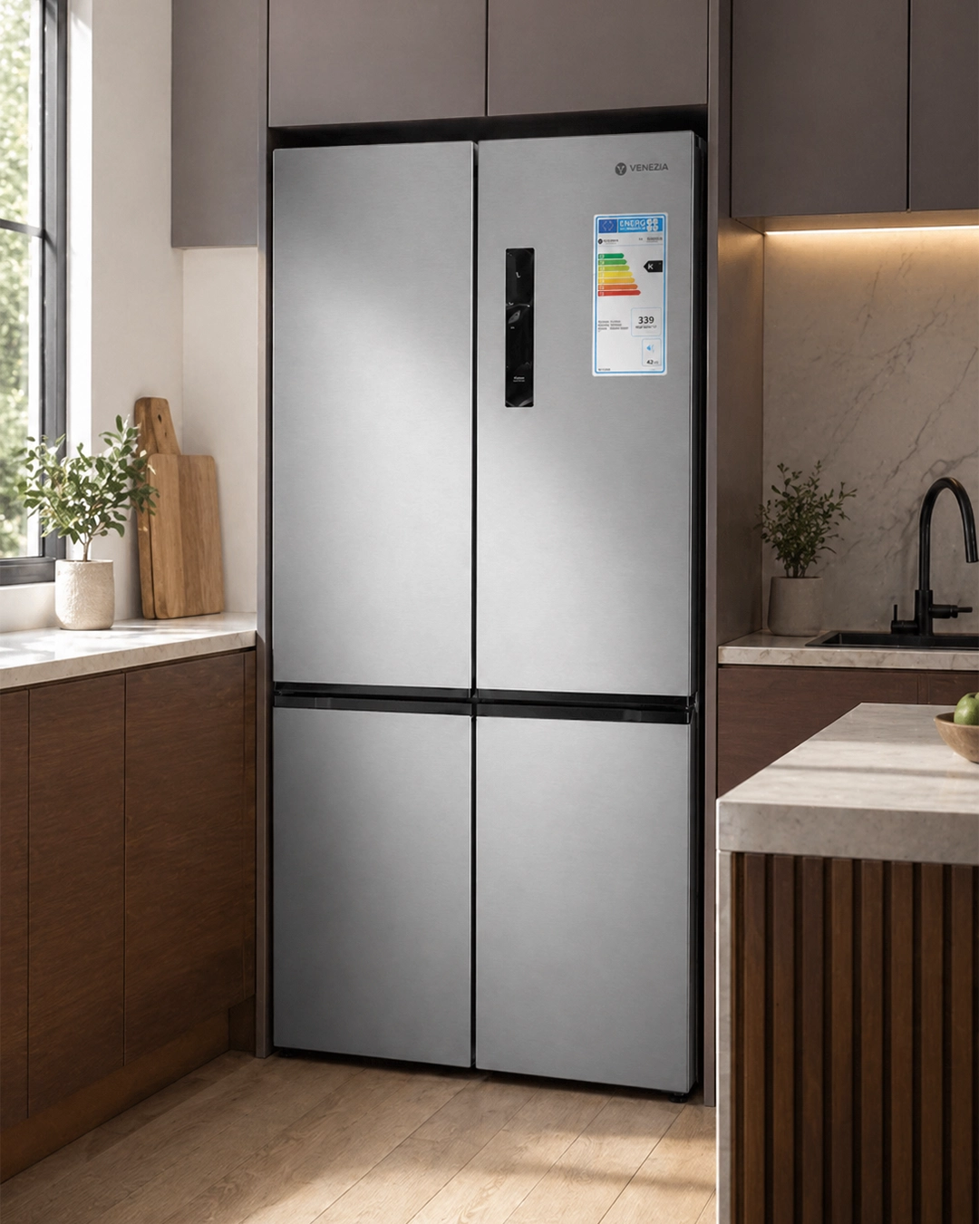 Le Réfrigérateur Venezia 4 portes 590L IR-590DD No Frost est recommandé pour les maisons, appartements, familles, cuisines principales et espaces de stockage domestique qui recherchent une solution de froid lisible, pratique et adaptée au marché marocain.